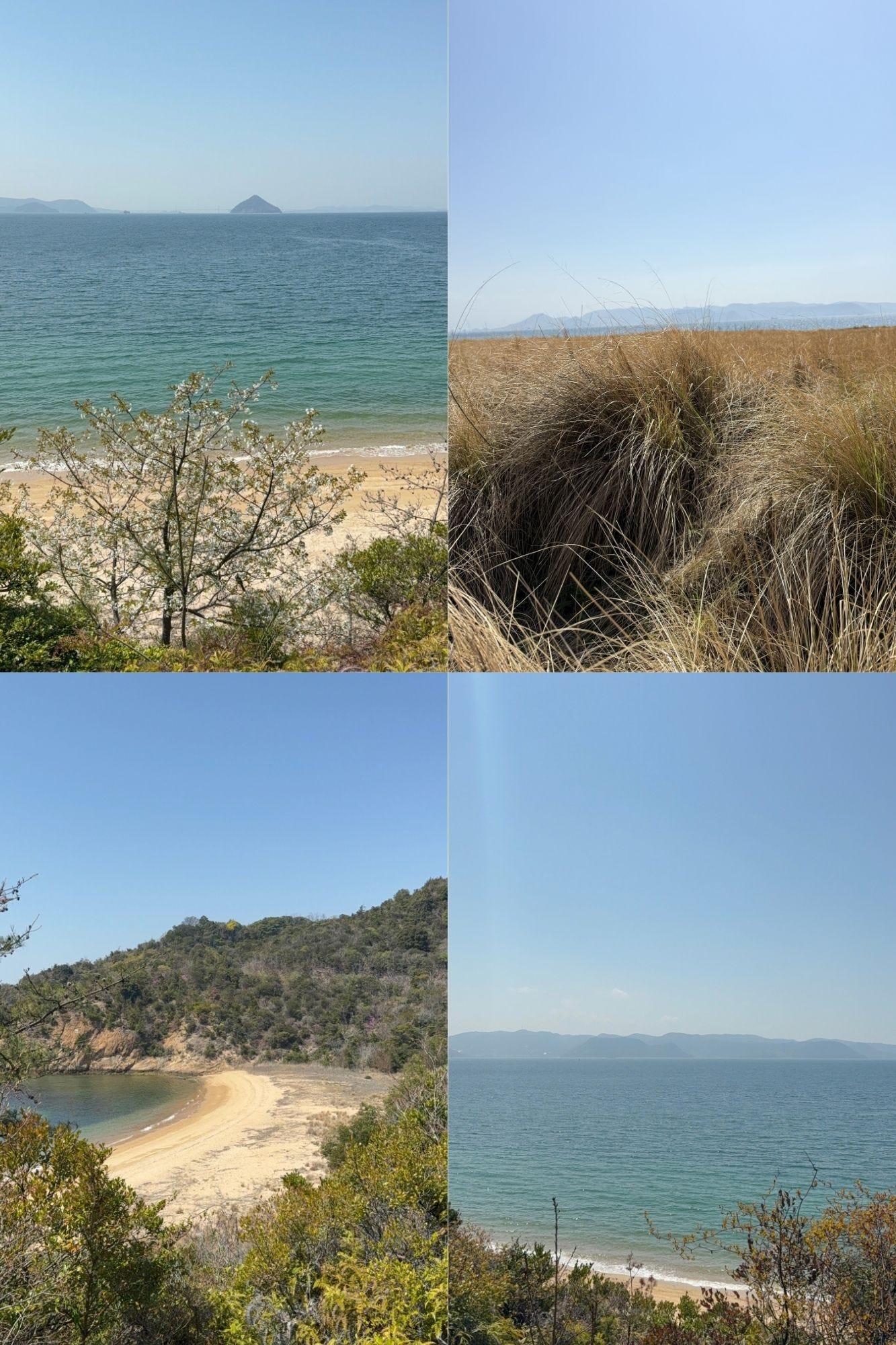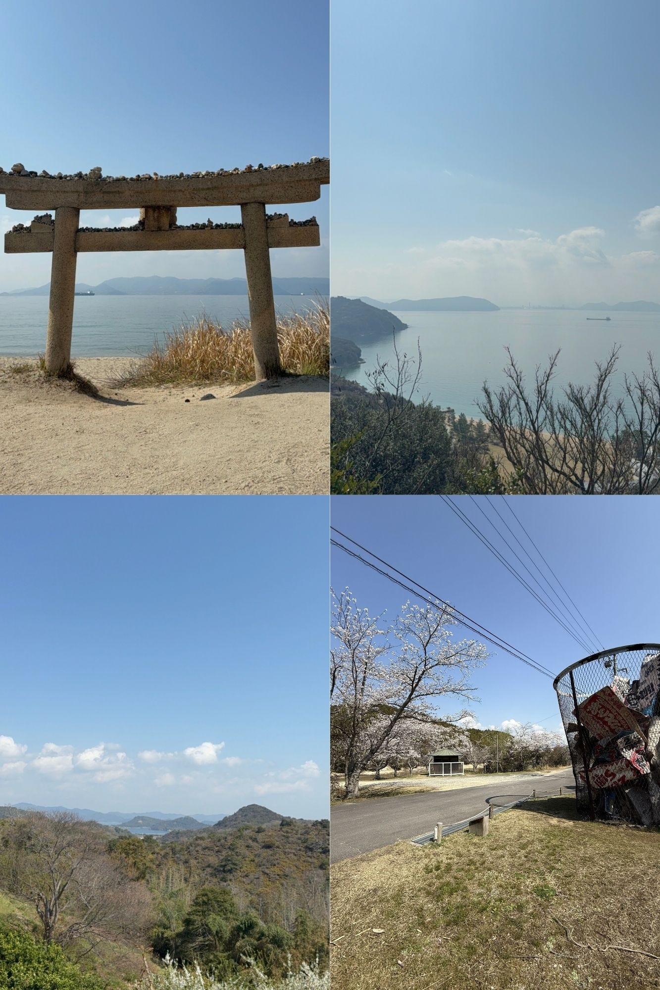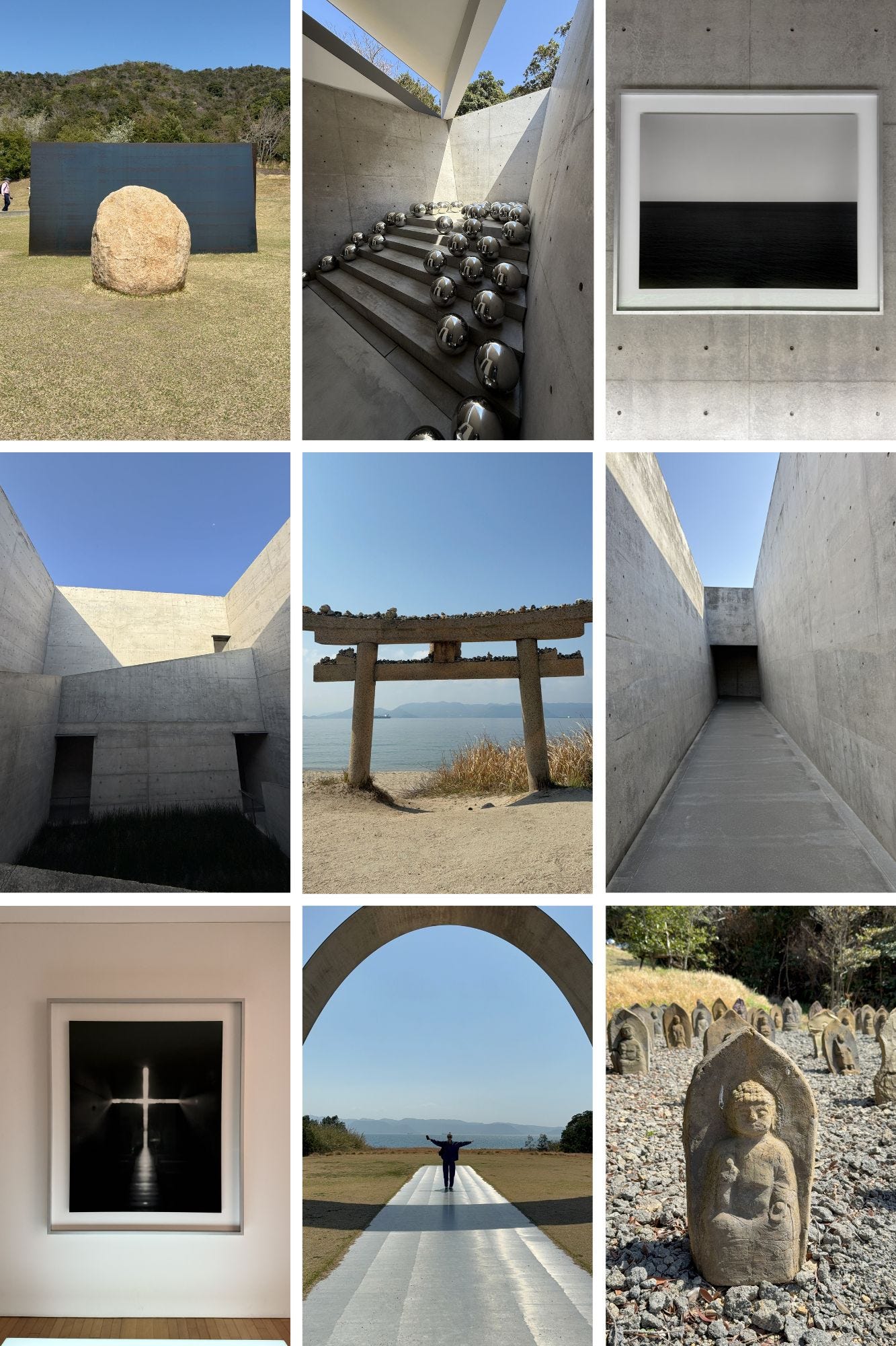 (6 April 2025) Naoshima: Refreshed after a good nights sleep I went for a run in the morning. The undulating landscape made running all the more tiring. I stopped at the top of one hill. The sun shone over the bay for a great view. I took some of the back roads on my descent. A large paper bin on the roadside overshadowed surrounding trees. Once back we picked up some breakfast from the only supermarket on the island. Wasting no time we headed straight to see some art. There was a mess of parked bikes by a fork in the road. No bikes were allowed past this point. A coastal road snaked down the hillside. There was a small gallery on our left as we walked down. Another instalment was sunk in a small hollow on our right. Both were put on the to do list. We powered down the hill. Time was of the essence. We had to stick to schedule due to our allotted viewing. As is the case with the bigger galleries on the island. The gallery had a rustic concrete interior. Dark corridors surrounded a courtyard. Rectangular windows offered views into an purposefully unkempt lawn. Small abstract photos were spaciously laid out on the walls. We exited via a café which overlooked a pond. Two matcha teas were ordered. Two differing opinions were held. Whilst my sister claimed hers was good, I thought otherwise. Its earthy, seaweed like taste still haunts me.