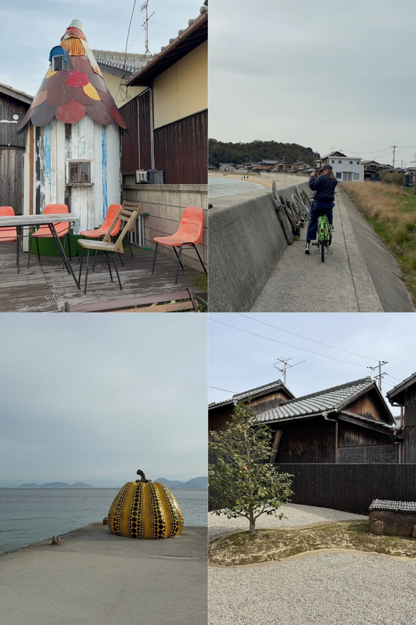 (5 April 2025) Naoshima: The ferry terminal was minimal. A small indoor area with a ticket office and a vending machine that served coffee. Our luggage became the makeshift furniture. A queue was scrambled together as soon as the ferry was in sight. The calm waters echoed the weather. The ferry docked at Naoshima. A small island of the coast of Okayama. Known for art galleries that dot the island. By the dock a large black pumpkin with orange spots stood looking out over the bay. A sign of things to come.