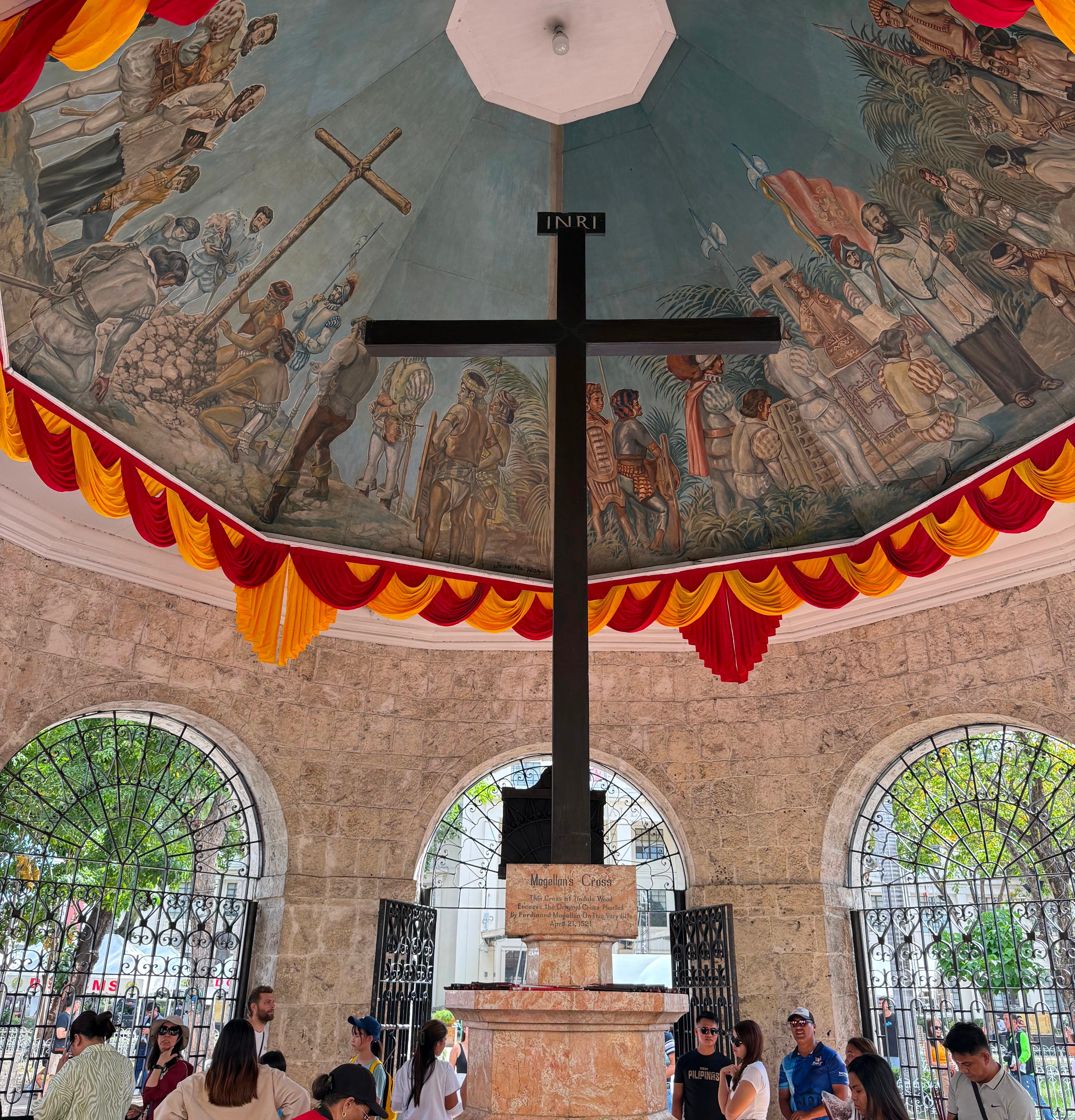 In 1521 a small fleet of Spanish ships landed in Cebu. They were led by the Portuguese explorer, Ferdinand Magellan. The Spanish were looking for a Western route to the Portuguese controlled âSpiceâ Islands. On arrival in Cebu, Magellan planted a large wooden cross. The cross still sits in Cebu over 500 years later. Christianity remains the countries largest religion to this day. Magellan would never make it out of Cebu. He died in a battle where Cebu International Airport now sits.