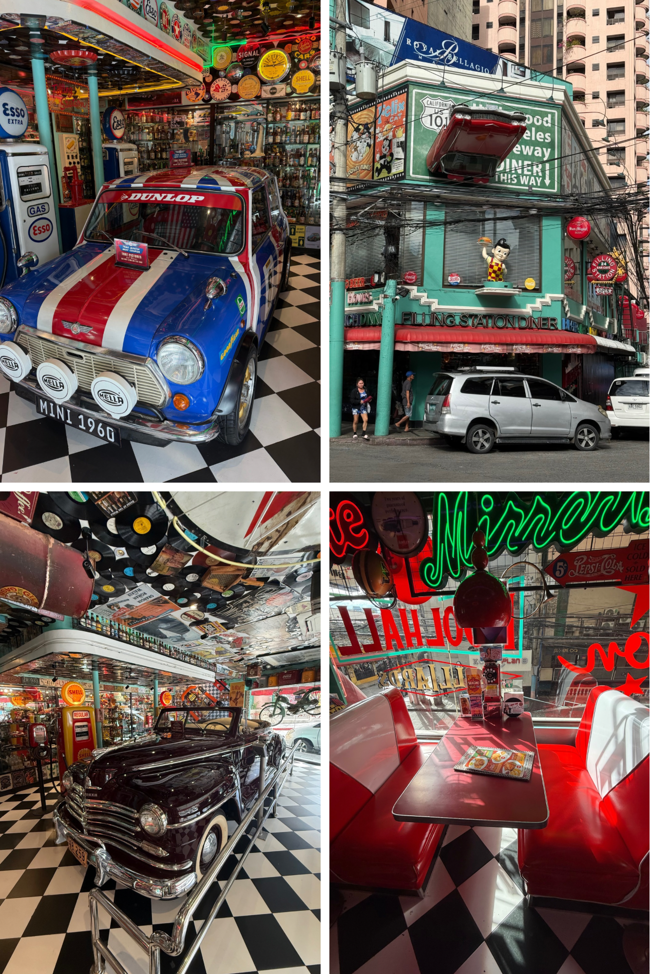 (5th Feb) Manila: Past American colonialism was evident. There were more tourists and backpackers from the âStates. Something you don't typically see elsewhere in South East Asia. Classic American diners were also popular around the city. The Filling Station being the most notorious. An upside down red car pokes eastwards out of the second story. The rest of the building is randomly tattooed with American memorabilia. Old Looney Tunes and Coca Cola signs standout. An classic black Plymouth car welcomes diners at the entrance. A Mini Cooper with adorned with a British flag seems a confused afterthought. Steak and Eggs were had in a stereotypical diner booth.