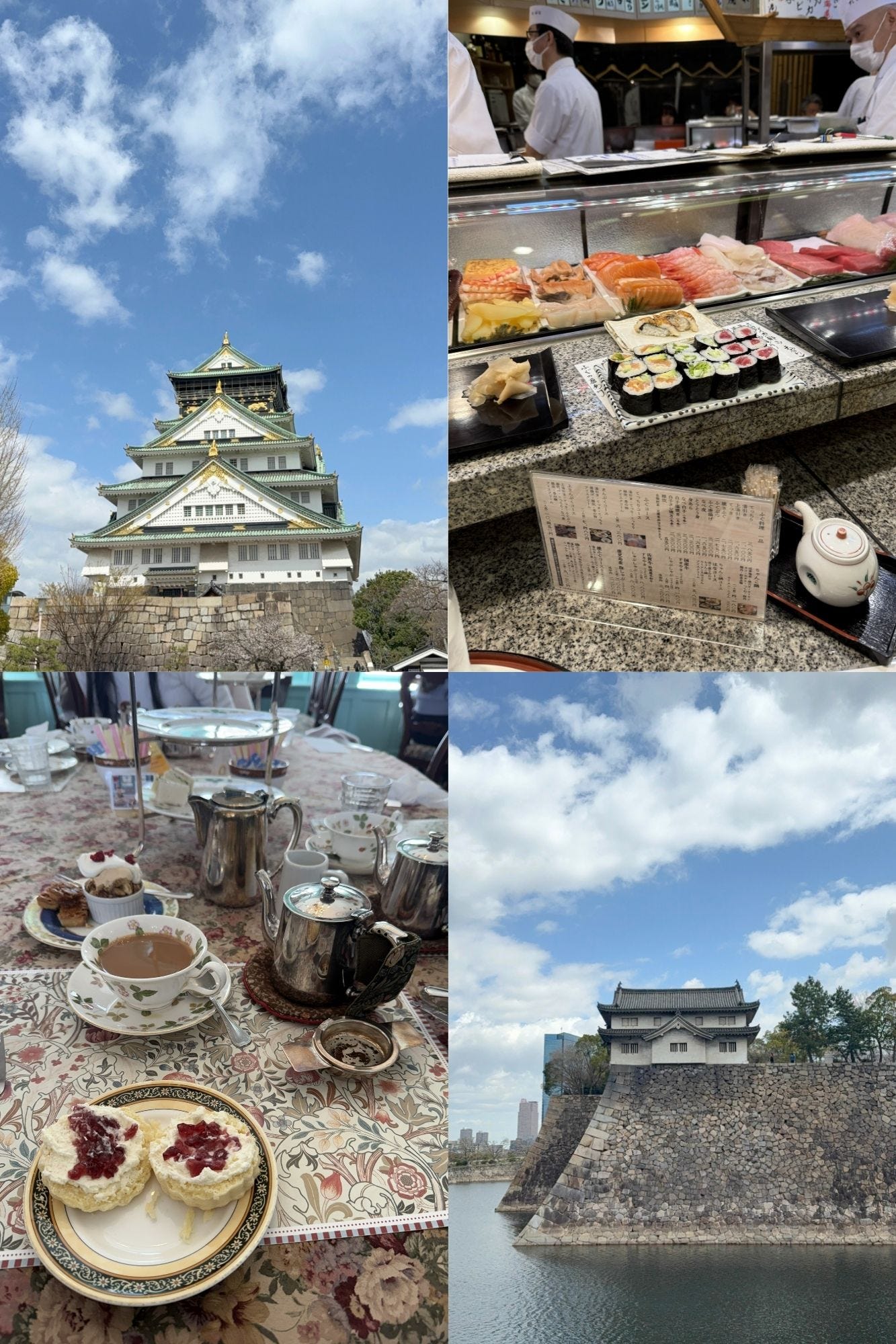 (03 April 2025) Osaka: I walked over to Osaka castle towards the end of the morning. A horse with no name by America rang through my headphones. Work duties had may sister confined to the hotel. I walked parallel to the river. Passing by an old British tea house on my left. A moat surrounded a walled fortress. The sun highlighted every small feature. I navigated my way through the legions of tourists. Centred in the middle of the courtyard was a single castle. Propped up on a bed of stone. It was shaped like a pyramid. Clear stratigraphical layers were broken up by sloped outer roofs. Gold decoration periodically decorated the white façade. I messaged my sister on my way back. I hadn’t stopped thinking about the British tea house. Inside was wooden and creaky. Befitting of something old and British. Signs signifying ‘teas of the orient’ were surrounded by Paddington bears and stuffed animals dressed as beefeaters. ‘How many person?’ ‘Two’ I held up the peace sign whilst saying so. ‘10 minute wait. Ok?’ I sat smiling in the stair well beneath a large British flag. I hummed the lyrics of Rule Britannia whilst waiting for my sisters imminent arrival. Darjeeling tea, scones (with jam and cream (cream to be layered first)), cucumber sandwiches, and a victoria sponge cake was the order. I was in heaven.