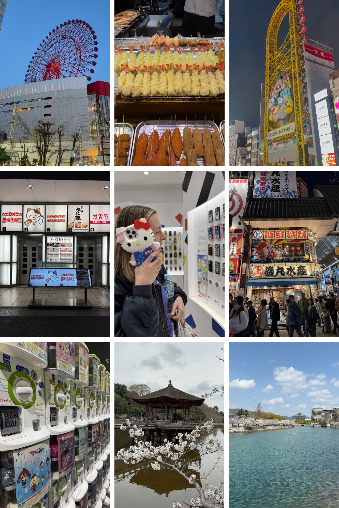 We wondered into the city after checking into our hotel. A large river bisected the old town. Narrow walkways are bracketed by wooden houses characters by their dark cedar frames. Bamboo curtains cover the exterior windows. A small stream ran parallel with the main river through the old town. Old cherry blossoms were hunched over the banks. Plagues of tourists made the streets feel even more cramped. It was tough to find a restaurant to eat in that evening. Most were full or booked up until late. We eventually found somewhere. Low stools faced an open kitchen. We were right next to the entrance. The occasional curious tourist would let in a frosty draft. Some gyozas and a bowl of tripe noodle soup soon warmed us up. After dinner we pottered back to the hotel. Intrigue pulled us into a nearby shop. It was lined with toy vending machines. They were stacked up high and formed a labyrinth around the shop. Inside each machine was a plastic egg with a collectible toy. The place was brimming with locals. My sister came away with a lion shaped watch. I left empty handed.