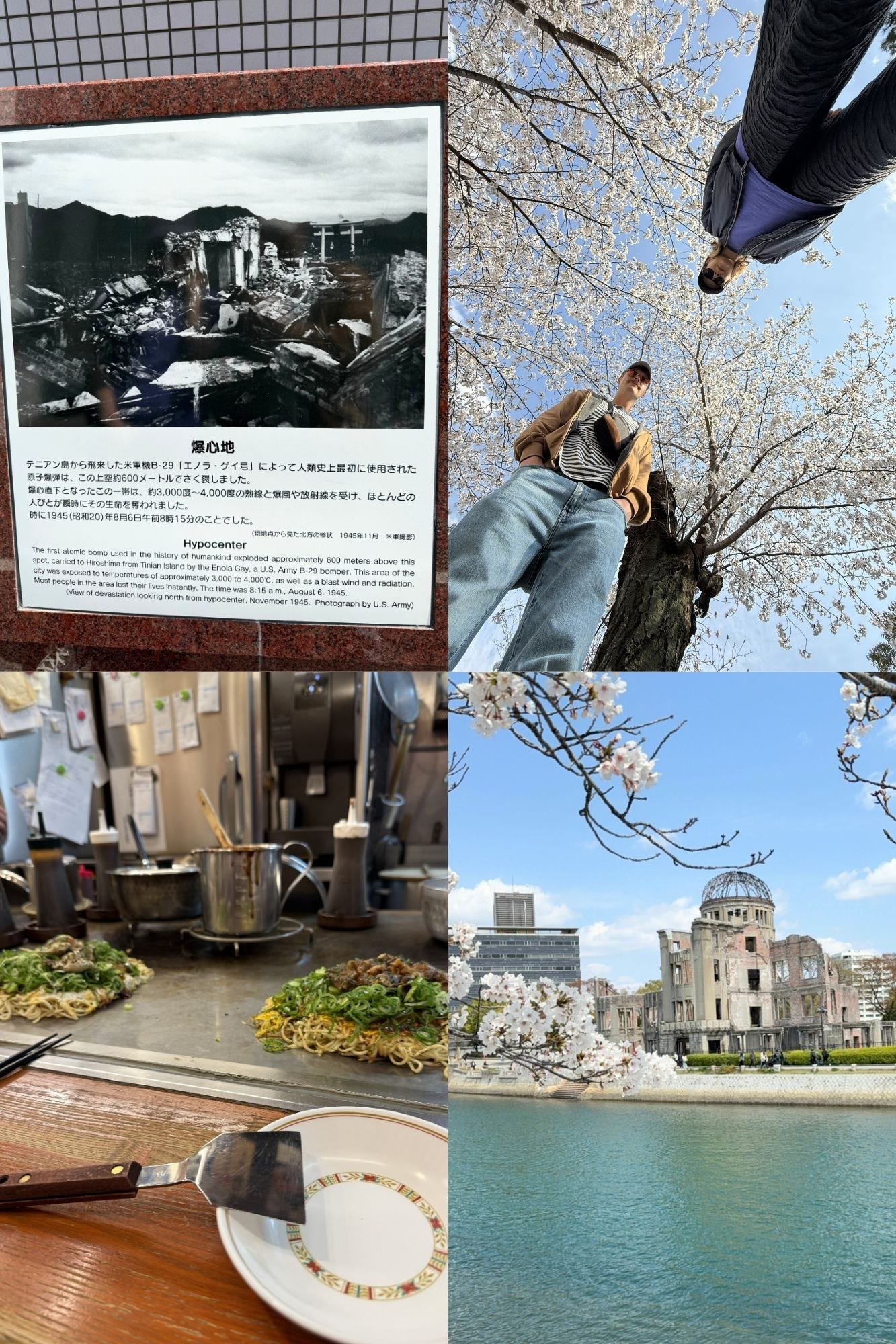 (04 April 2025) Hiroshima: It was sunny when we arrived. We chucked our bags in the luggage hold of the hotel before wandering down to the memorial. It was a short walk from our hotel. There was a small concrete arch at the back of a large industrial looking courtyard. Through it you could see a pond, with a flame at the end, and the iron skeleton of a domed roof. On the far side of the pond was a slow moving river. We sat on steps that led down to the waters edge. In prime view of the Genbaku dome. A building near the hypocentre that survived the blast. 15 minutes of basking in the sun raced by. We crossed the river and found a quiet street. A small plaque on a modern building indicated the hypocentre. Very few tourists knew it was there. Our mood had dropped. The museum itself is a stark reminder of the horrors of war. First person stories, paintings and photos highlight the horrors of the blast. The exit took us back to the river. Cherry blossoms in full bloom lined the banks. We headed into town to cheer ourselves up. A packed elevator had us imitating sardines in a can. Stickers, posters and graffiti took up every inch of the interior. The doors reeked opened. Everyone flooded out into a food hall. We inspected all the counters before realising they were all serving the same thing. Okonomiyaki. It is a famous dish in Hiroshima. Layers of noodles, cabbage, and pork and fried on a hot plate. Much like the elevator we were crammed into a small corner. Rubbing shoulders with other diners. An early night beckoned before an early train.